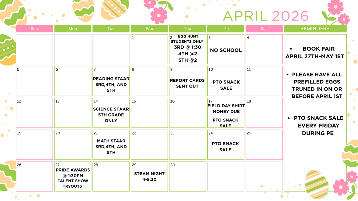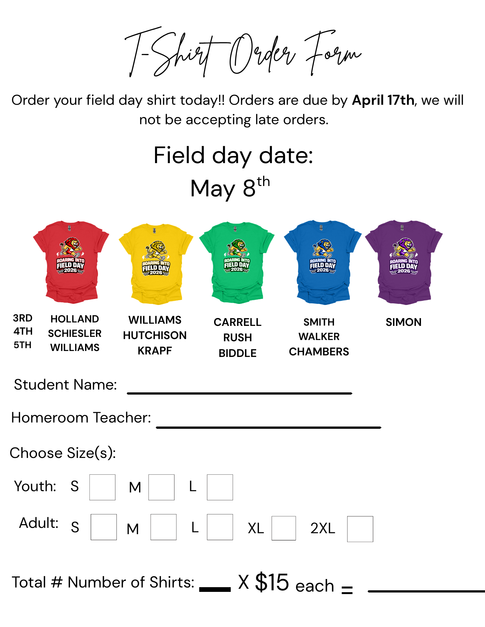 March 24, 2026 FIELD DAY T-SHIRT FORM These will be going home with students today. It is early but the deadline is April 17th!!! We can not except late orders so please have them turned in on or before April 17th. The shirts will be g...