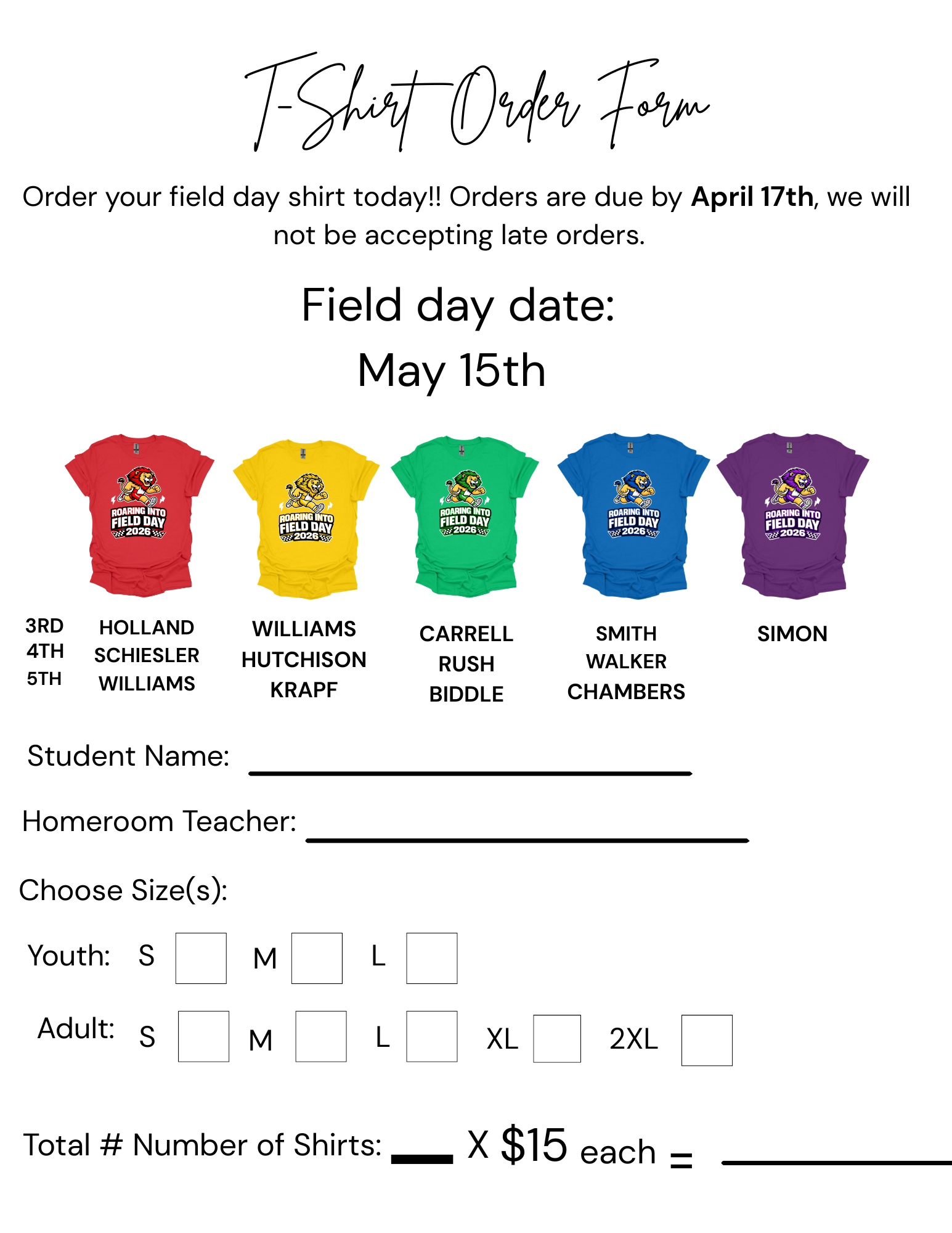 April 13, 2026 FIELD DAY HAS BEEN MOVED TO MAY 15TH!!!!! T-SHIRT ORDER FORM IS DUE BY APRIL 17TH. NO LATE ORDERS